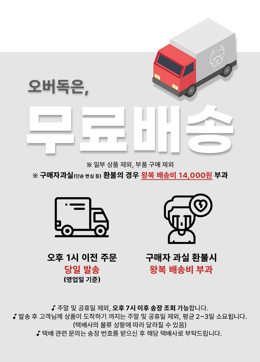- 상품, 또는 배송 문제로 인한 교환/반품비는 무료이며 고객 귀책 사유일 경우 왕복 택배비는 고객 부담입니다.