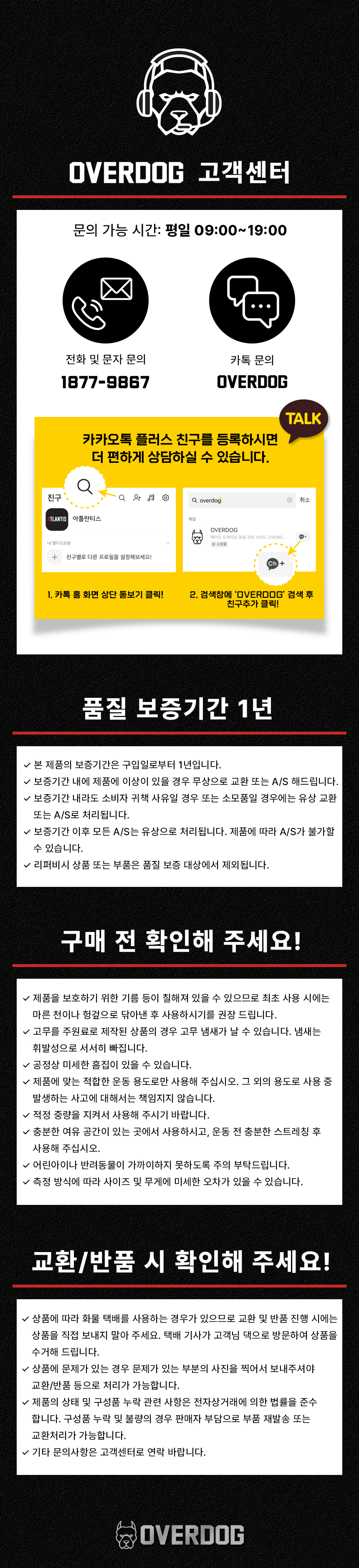 - 상품, 또는 배송 문제로 인한 교환/반품은 제품보증기간인 주문 일로부터 1년(365일)이내 가능합니다.